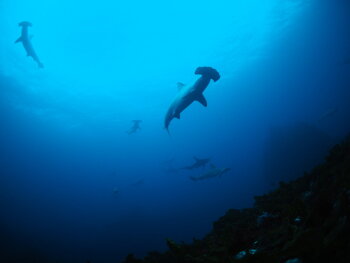 6月~9月の黒潮が大島に近づく季節限定のダイビングです。日の出時刻にエントリーしてハンマーヘッドの群れをねらいます。特に、ダイビングポイント「ケイカイ」では日の出から1時間程度というピンポイントで、高確率でハンマーヘッドの群れが見られます。日の出時刻とともにエントリー(夏場は午前4時台です)、潮流が速いほど確率が上がる、という特殊なダイビングなので、2023年8月1日より大島ダイビング連絡協議会により下記のような参加基準が設けられました。