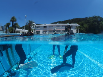 器材の使い方から、ダイビングに必要なさまざまな技能を1日かけて練習します。